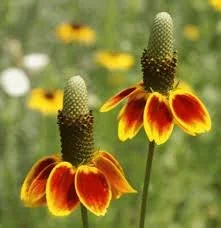 Also known as Preirie Coneflower. This plant is leafy on the lower part with long leafless stalks with flowerheads. They can be yellow and red-brown, drooping rays surrounding a long, re-brown central disk. The colorful flowerheads resemble the Mexican hat of Mexican fiestas.