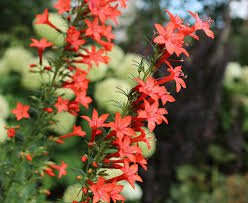 Tall upright perennial. It has brilliant red tubular flowers that run through the entire length of the spike. It grows 2-5 ft. Requires a very dry, well-drained soil in full sun and partial shade. It blooms from June-August. It attracts hummingbirds and butterflies to the garden.